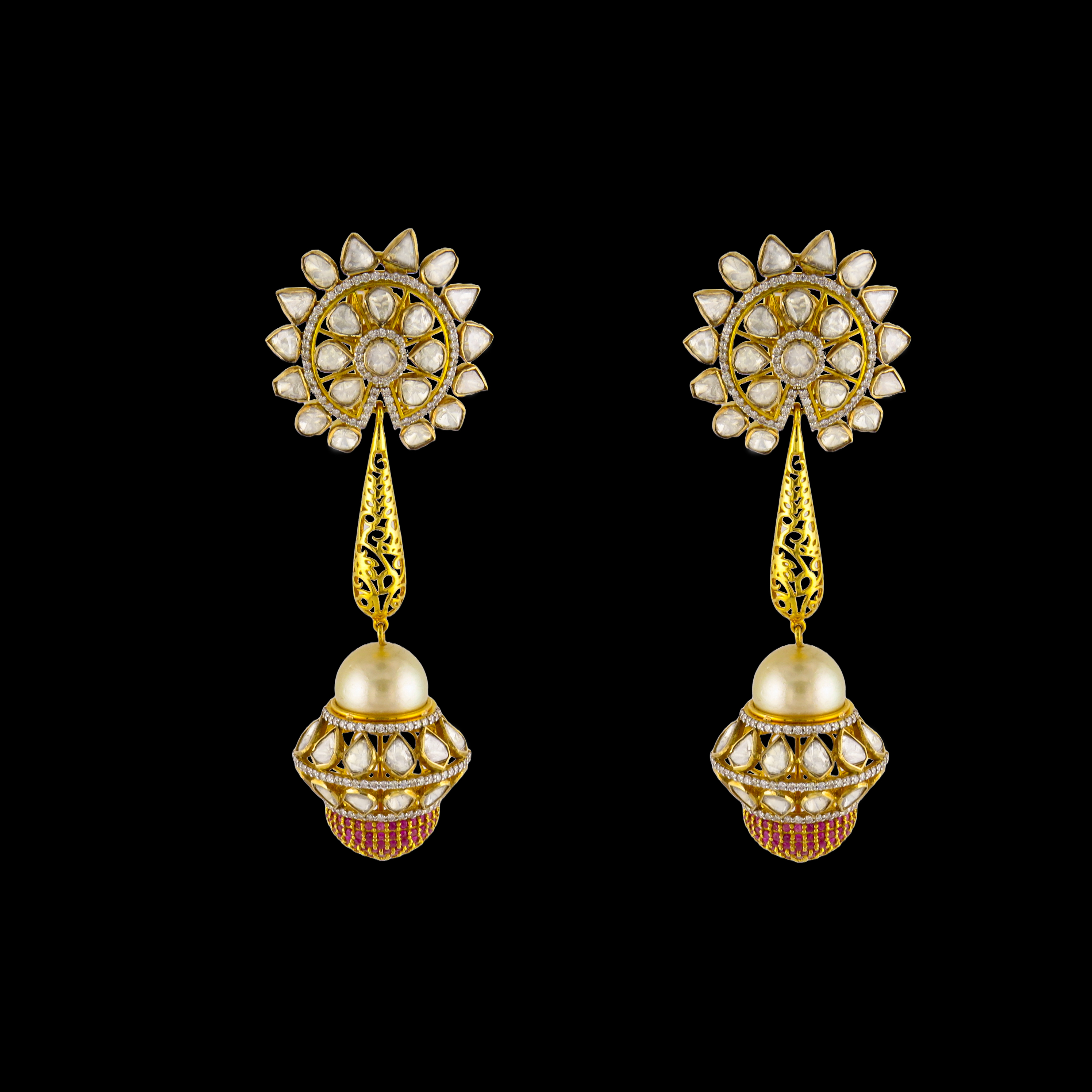 18K Gold Polki Earrings with Filigree Work & Pearl Jhumka Drops