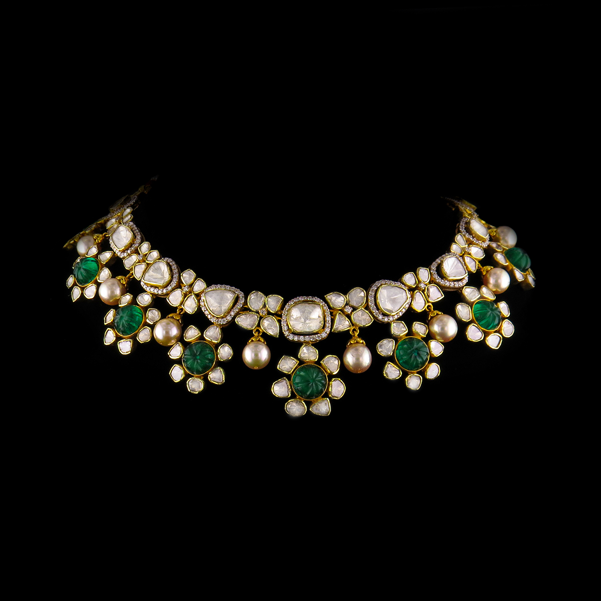 Indulge in timeless luxury with this finely crafted 18K gold choker set featuring carved emerald floral motifs, uncut real polkis, dazzling natural diamonds, and pristine pearls. The masterful combination of textures and gems forms a regal composition that’s both rooted in tradition and elevated with contemporary finesse. Paired with matching drop earrings, this set brings together royal grandeur and artistic craftsmanship.